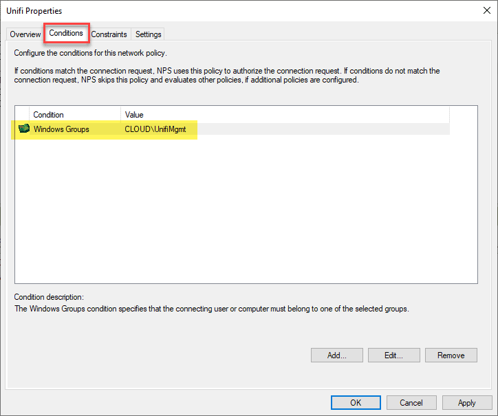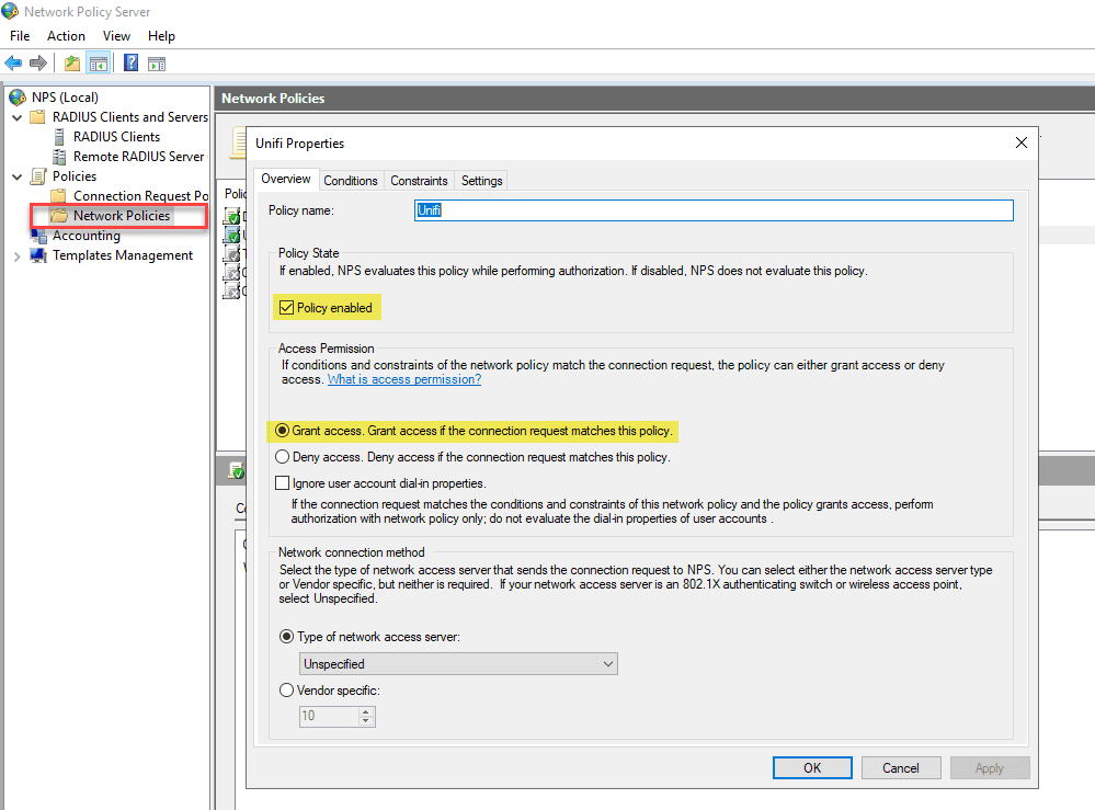 Once you have the RADIUS clients (Unifi APs) added to your RADIUS clients of the NPS server, you are ready to create the Network Policy. The network policy is essentially the requirements of the connection.