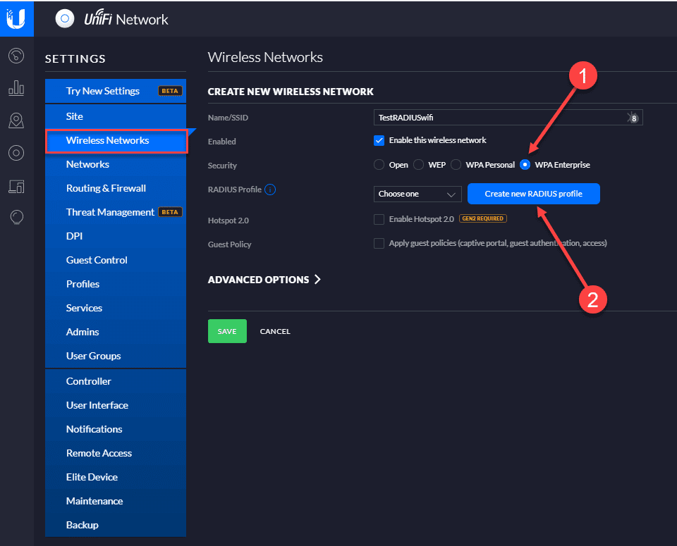 The first step we will take is setting up a new wireless network in our Unifi controller UI. To use RADIUS, we will create a new wireless network that is WPA Enterprise enabled on the Security setting.