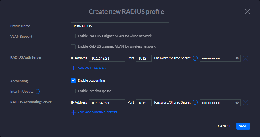In the Password/Shared Secret, enter the shared password that will be used by the Unifi APs to authenticate with the RADIUS server.