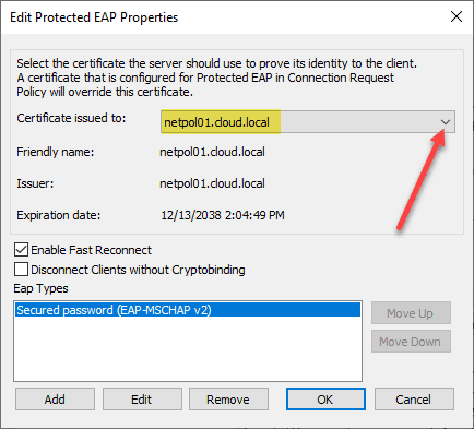 Select the certificate to use with PEAP. If you don’t have a certificate available, you can generate a self-signed certificate by using the PowerShell command: