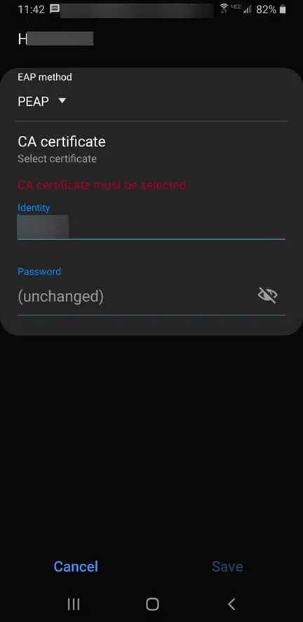 This is an Android device. I have selected the EAP method of PEAP. Under identity, this is where you place your Active Directory user. A note here, you don’t have to prepend the NETBIOS domain name in front, only the username. Then enter the AD password.