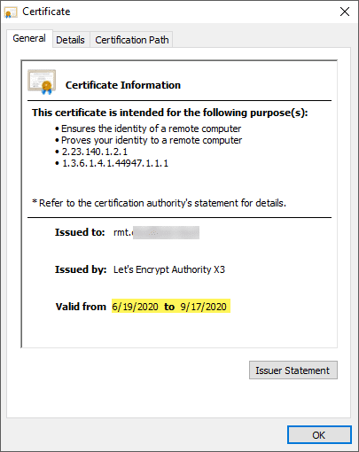 Once you refresh your browser session, you can view the certificate that is presented and make sure it is the new certificate you have installed. You can verify this by the Issued to as well as the Valid from fields.