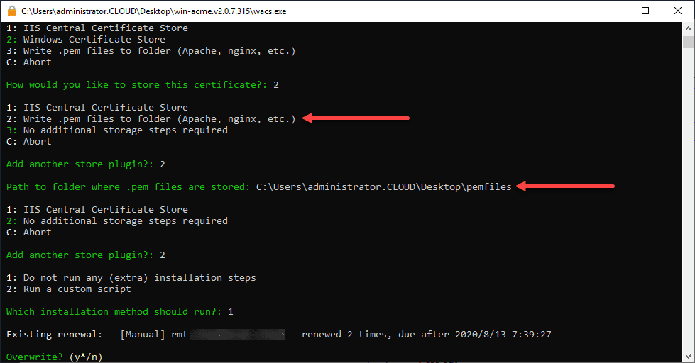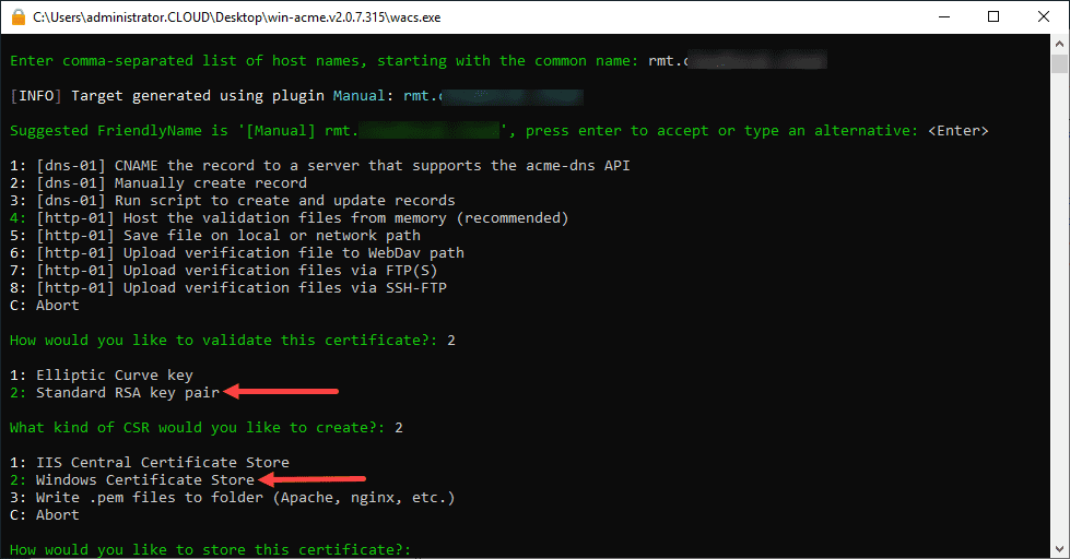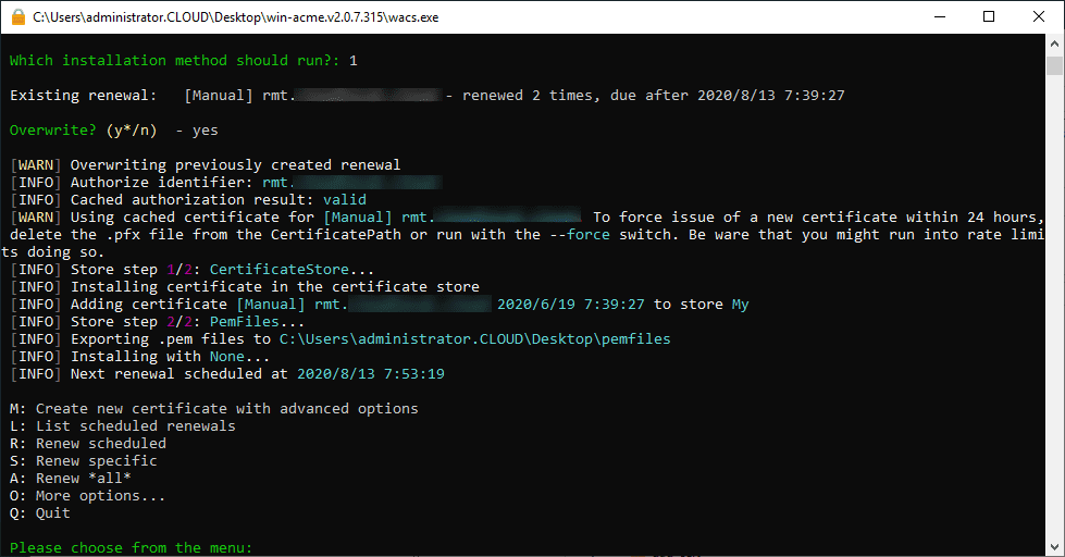 - On the Windows-based Horizon Connection Server, run the Let’s Encrypt “win-acme” program to generate the certificate in the local certificate store