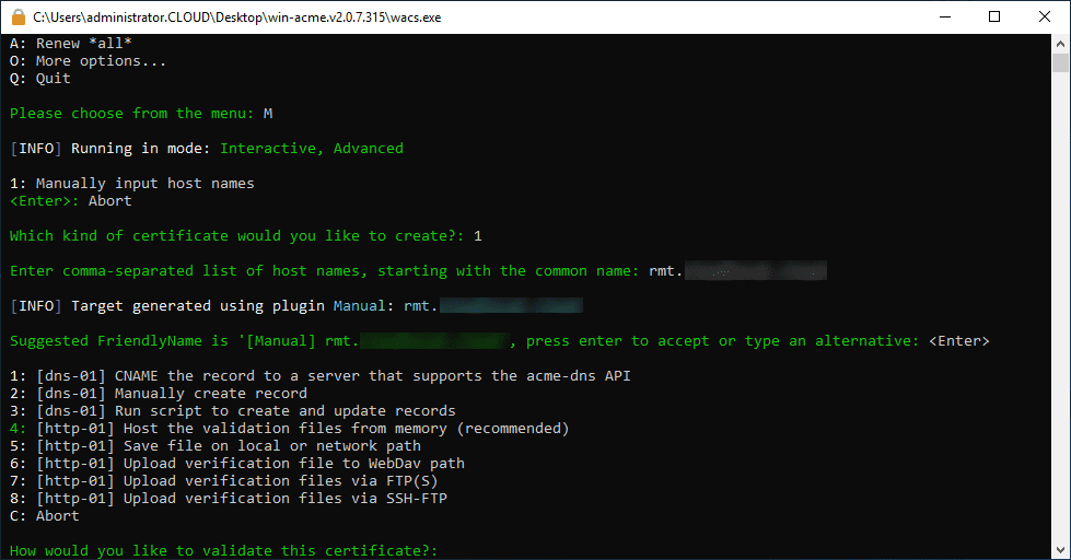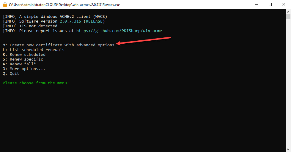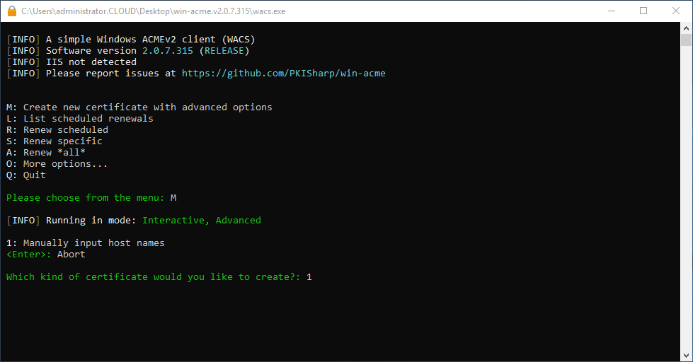 The win-acme tool is basically a wizard via the command line that provides a workflow based on the inputs you give to the menus. Here we are going to Create new certificates with advanced options.