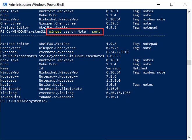 As you notice above, when we search for a keyword such as Note, it will return all applications that may not have “note” in the name, but may have it in the Id or Tag field. This may still be too many returned results to see which apps you can install with winget. Maybe you know the software you are looking for has “Note” in the name. How can we filter it down even further?