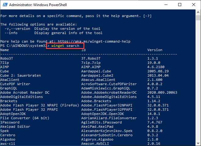 As you notice the search option allows you to find and show basic info of apps. What happens when you simply type winget search? When you type this, you will get a table view return of the following: