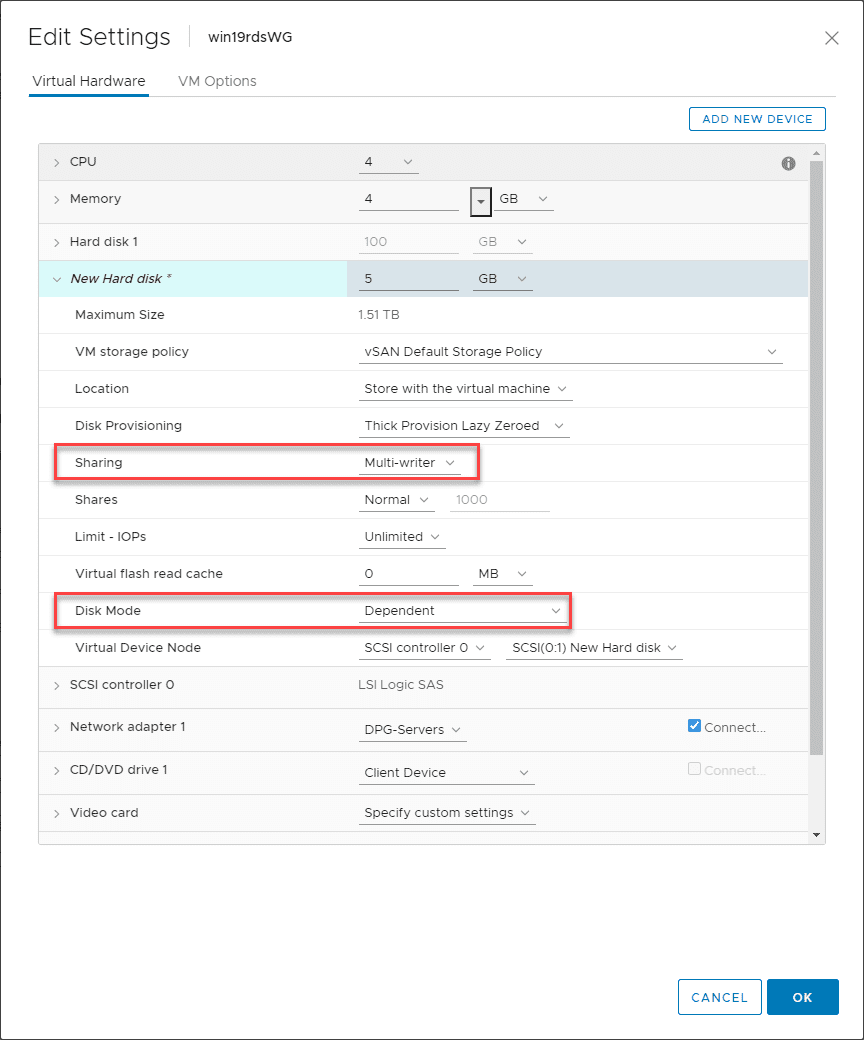 If you don’t change the default setting when you created a multi-writer disk, the disk mode will be dependent. In this configuration, you will not be able to create backup of the VM using today’s backup solutions that make use of vStorage APIs.