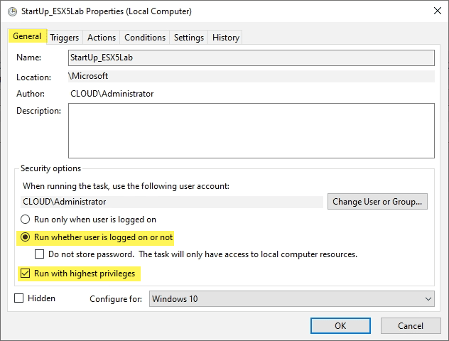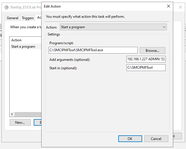 Below, I have an example of how to configure your Windows scheduled task to run the commands needed to both startup and shutdown your Supermicro VMware home lab.