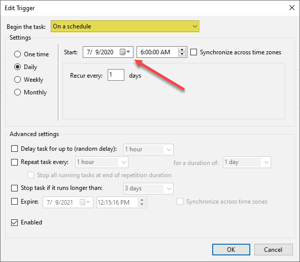 Under the Trigger tab, this is where you configure the schedule for running the Windows scheduled task. Here I have my lab starting up at 6 a.m. in the morning. This will give it enough time to power on, boot the VMs, and settle down before I get started in the morning.