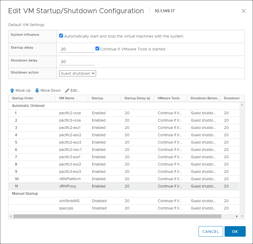 Below, as you can see, I have configured the Automatic Ordered startup and shutdown as well as the startup and shutdown delay. Make sure you select for the Shutdown action to perform a guest shutdown. This will trigger the VMs to perform a graceful shutdown.