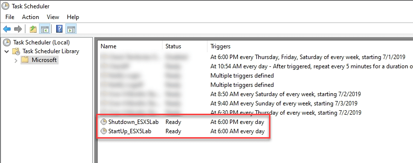 Do the same for configuring your shutdown command. Below, you see I have both the Startup and Shutdown tasks configured and ready to go. The lab will basically run from 6 a.m. to 6 p.m.