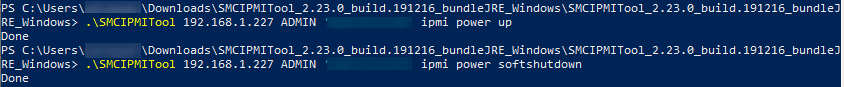 - Add arguments – Enter your IPMI IP address, ADMIN user and password as well as the power up or the power softshutdown command.
