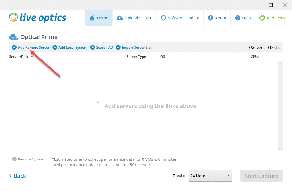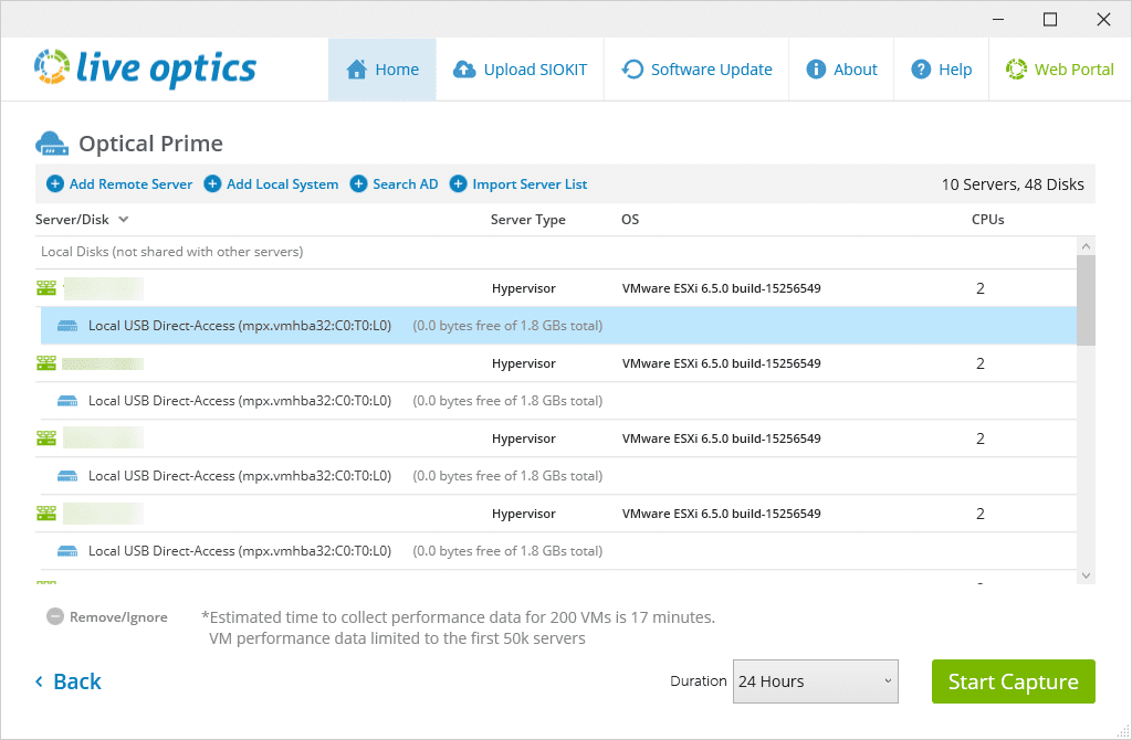 Verify the hosts, storage and other information that is presented in the Dell Live Optics screen. If you are ready to start the capture, you can click the Start Capture button. The default duration is 24 hours which is what works for most sizing recommendations.