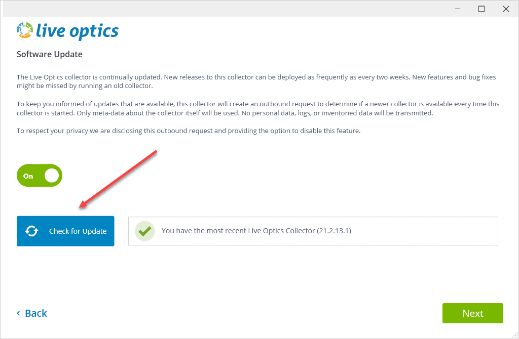 If you are downloading Live Optics fresh, most likely you will have the latest version, however, if you are rerunning from a previous download, it is a good idea to Check for update. Click Next.