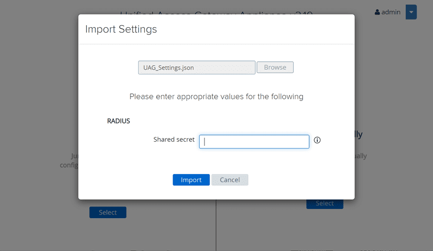 Browse to and select the JSON file that you downloaded from the export process of your older appliance. If you had RADIUS configured, you will need to reenter your shared secret password. Once you are ready, click the Import button.