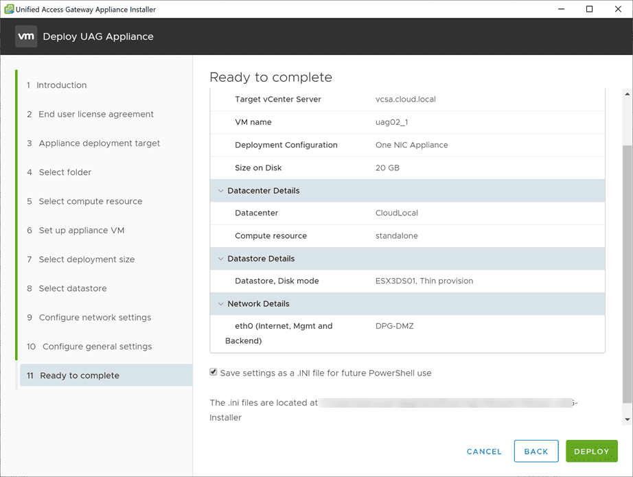 The appliance is ready to deploy. You can also optionally Save settings as a .INI file for future PowerShell use.
