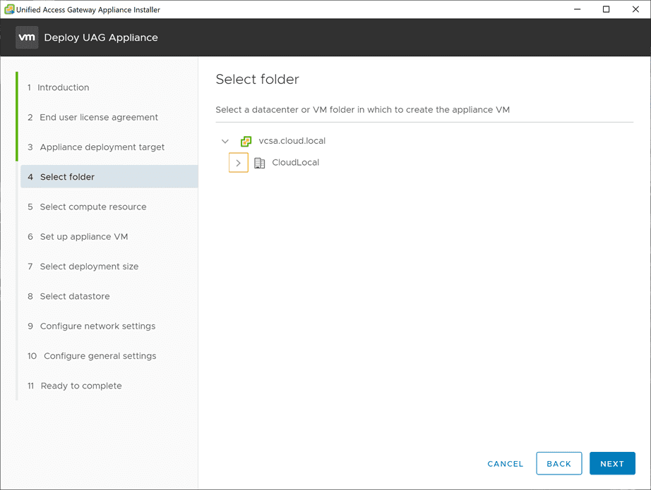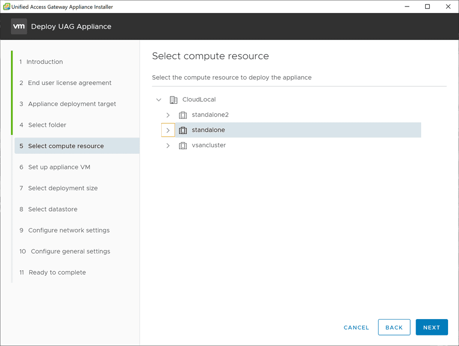 Choose the compute resource for deploying the Unified Access Gateway appliance.