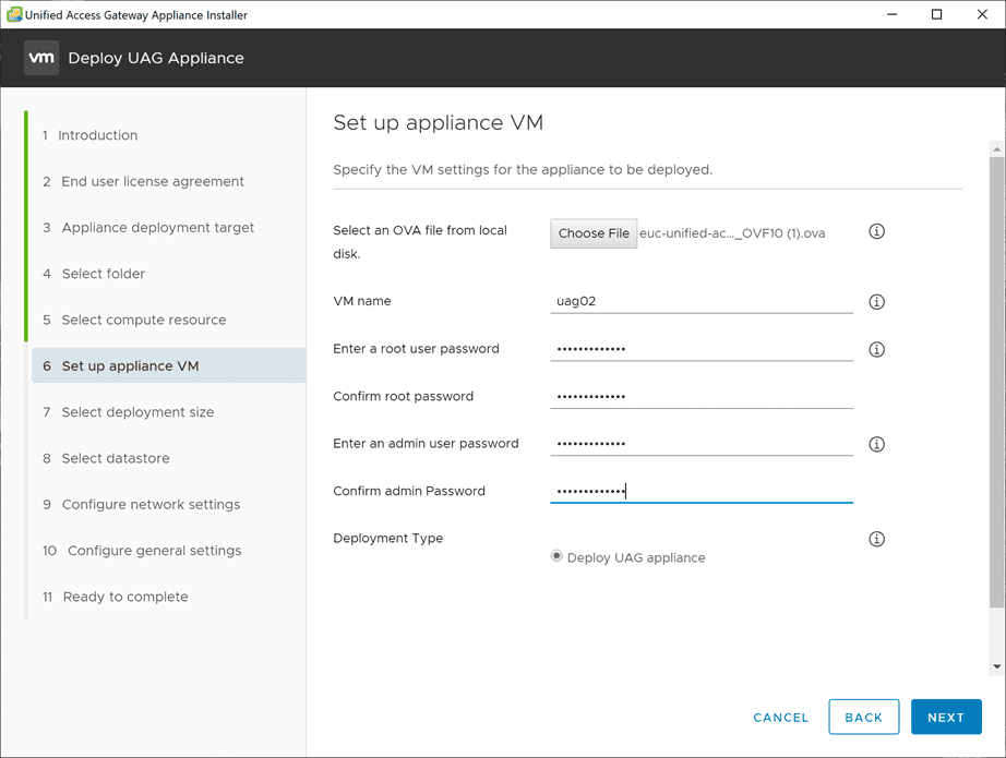 Choose the OVA appliance file that you downloaded for the Unified Access Gateway 3.10 appliance. Also, configure the root and admin passwords.
