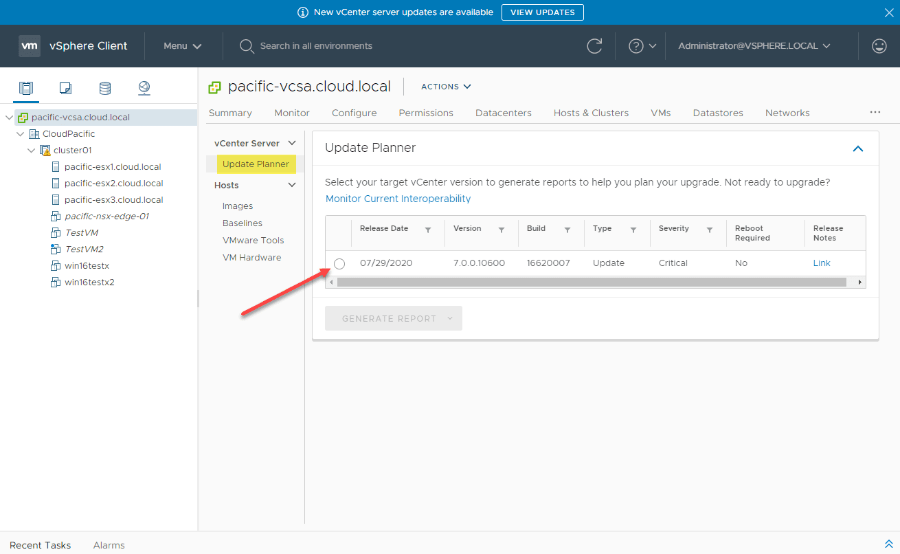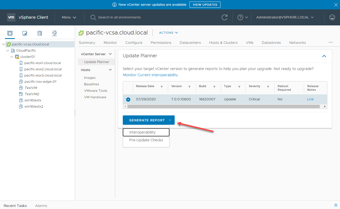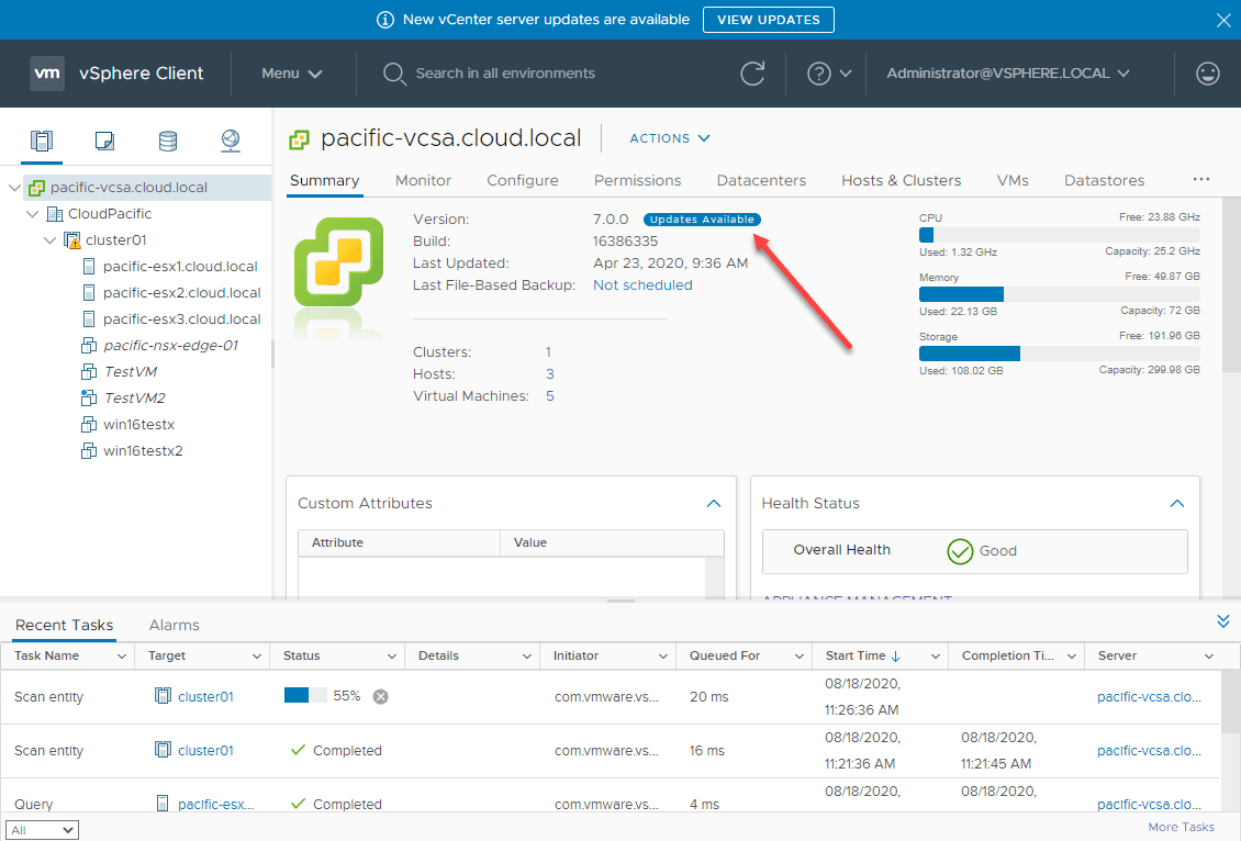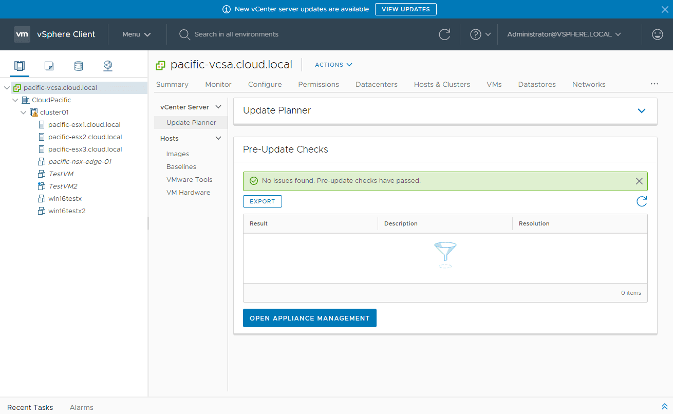 The new update planner visibly alerts the vSphere administrator to updates that are available in the vSphere environment. Note when you have focus on your vCenter Server in the vSphere Client, you will see the Updates Available next to the version number. Also, if you don’t have focus on your vCenter Server, the blue ribbon in the top of the vSphere Client visually alerts to available updates.