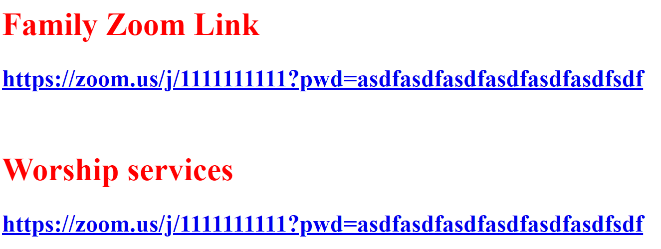 <h1> </h1> <h1><span style="color: #ff0000;">Family Zoom Link</span></h1> <h2><a href="https://zoom.us/j/1111111111?pwd=asdfasdfasdfasdfasdfasdfsdf ">https://zoom.us/j/1111111111?pwd=asdfasdfasdfasdfasdfasdfsdf </a></h2> <p> </p> <h1><span style="color: #ff0000;">Worship services</span></h1> <h2><a href="https://zoom.us/j/1111111111?pwd=asdfasdfasdfasdfasdfasdfsdf">https://zoom.us/j/1111111111?pwd=asdfasdfasdfasdfasdfasdfsdf</a></h2> <p> </p>
