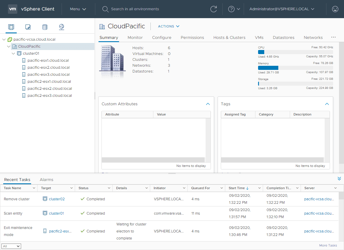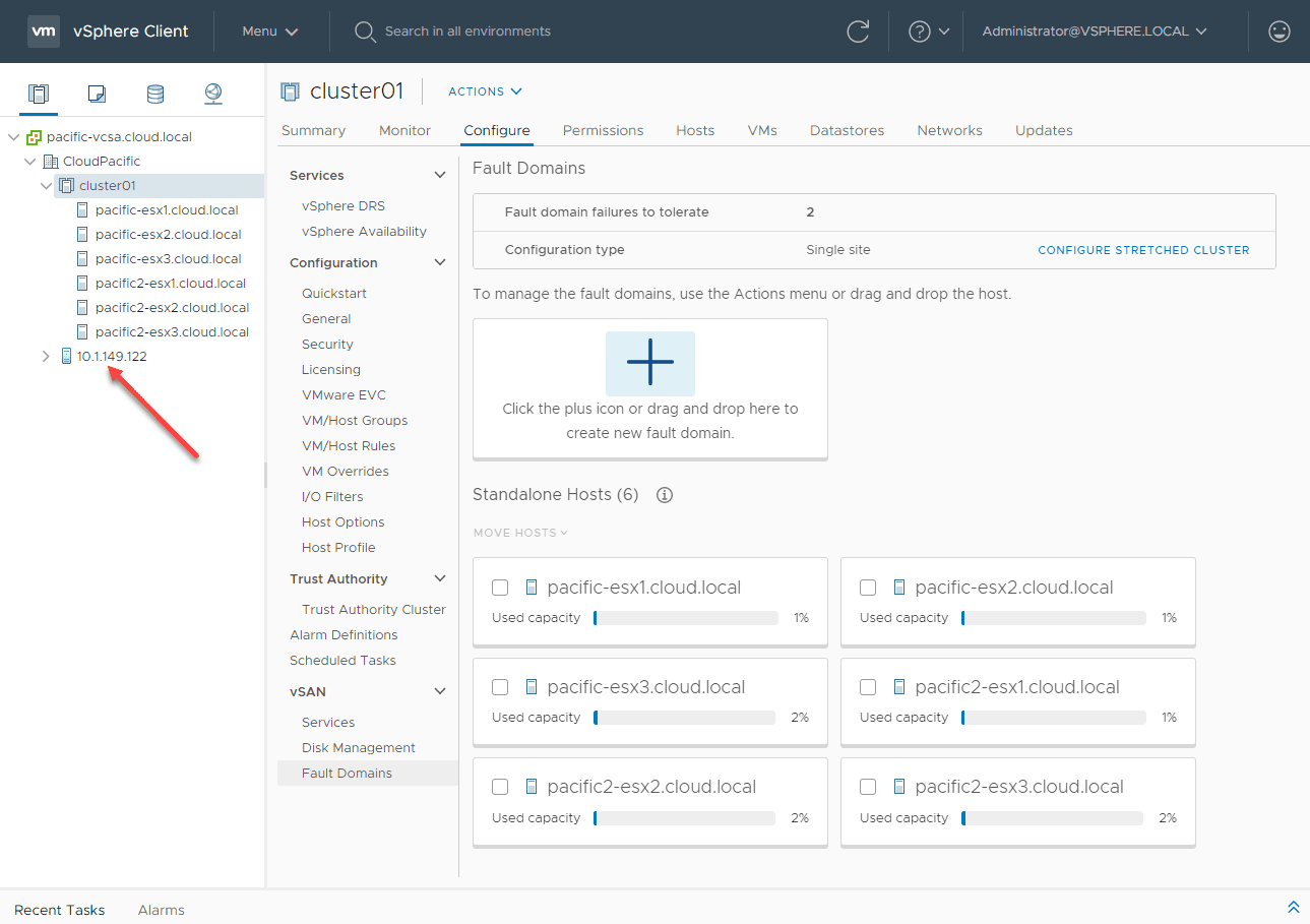 Let’s look at the configuration of the stretched cluster. Below, you see I have the vSAN hosts in a single cluster.