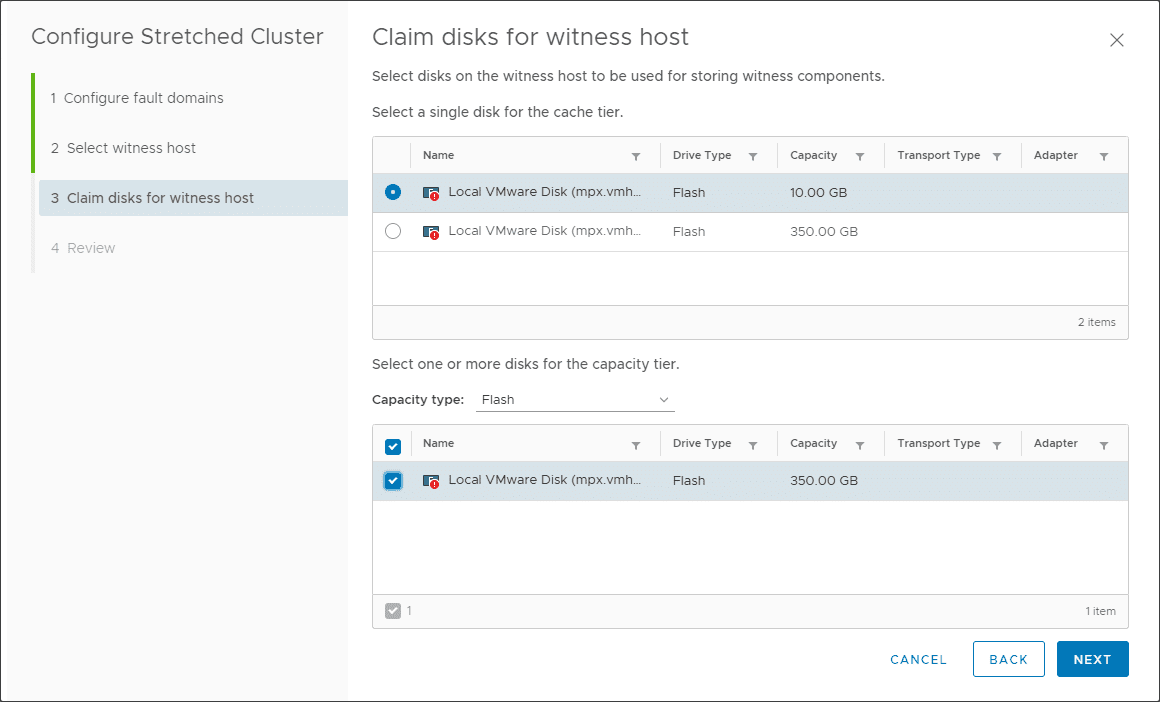 It will ask you to claim the disks for the witness host for vSAN. Even though no data is stored on it, you still have to designate the cache and capacity disks.