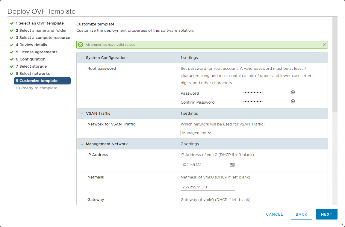 I have skipped forward in the screenshots here as most of the others are just standard OVA deployment screens choosing storage, hosts, etc. The Customize template screen has you set the password, IP address settings and choose which interface will be the vSAN interface. All of these configuration details are important.