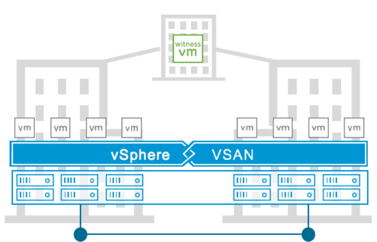 There is a special “third site” that houses the witness host which does not participate in housing virtual machine data, but rather special metadata that establishes quorum. Each of the special vSAN sites (2 Data sites, and 1 witness site) is considered a fault domain.
