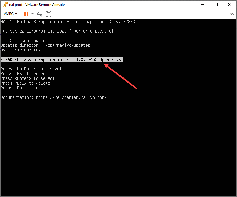 Select the updater.sh script for NAKIVO Backup & Replication v10.1. Press Enter to select.