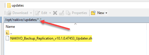 First, upload the updater.sh script to the NAKIVO Backup & Replication appliance. This file is uploaded to the /opt/nakivo/updates/ directory.