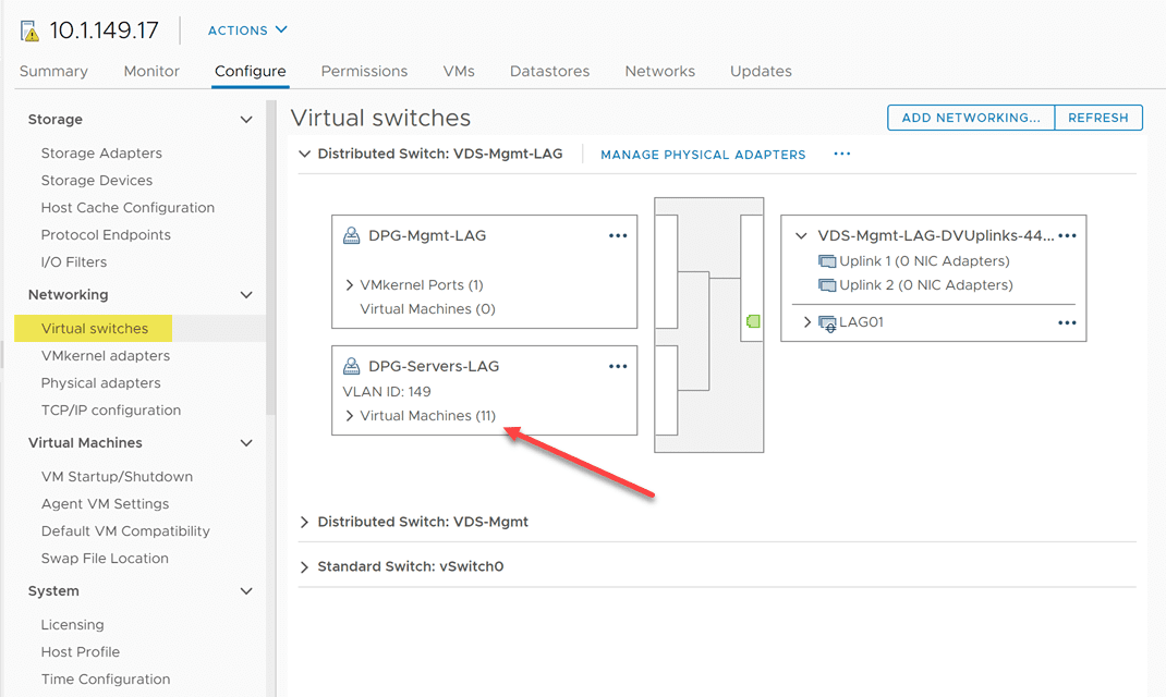 Now, the nested ESXi hosts have a vSphere Distributed Switch provisioned that is running on top of the VDS on the physical ESXi host. Note, you can’t tag frames in your nested ESXi host configuration. However, keep in mind the ESXi traffic from the nested server will be tagged with the VLAN of the physical ESXi host port group it is attached to.