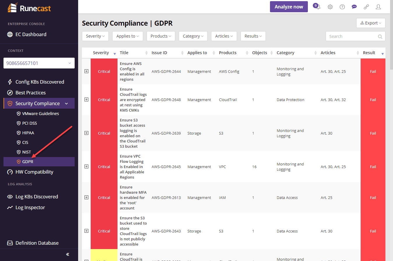 After adding your AWS environment, you simply need to scan it for potential issues. Runecast takes the heavy lifting out of how the information is displayed as well. Under the section, Security Compliance, you will see the GDPR listing. Click here to see the GDPR-specific findings.