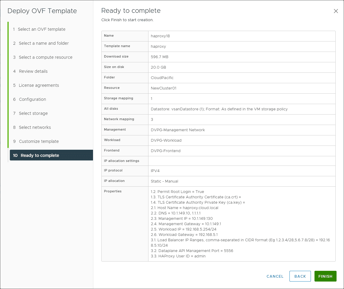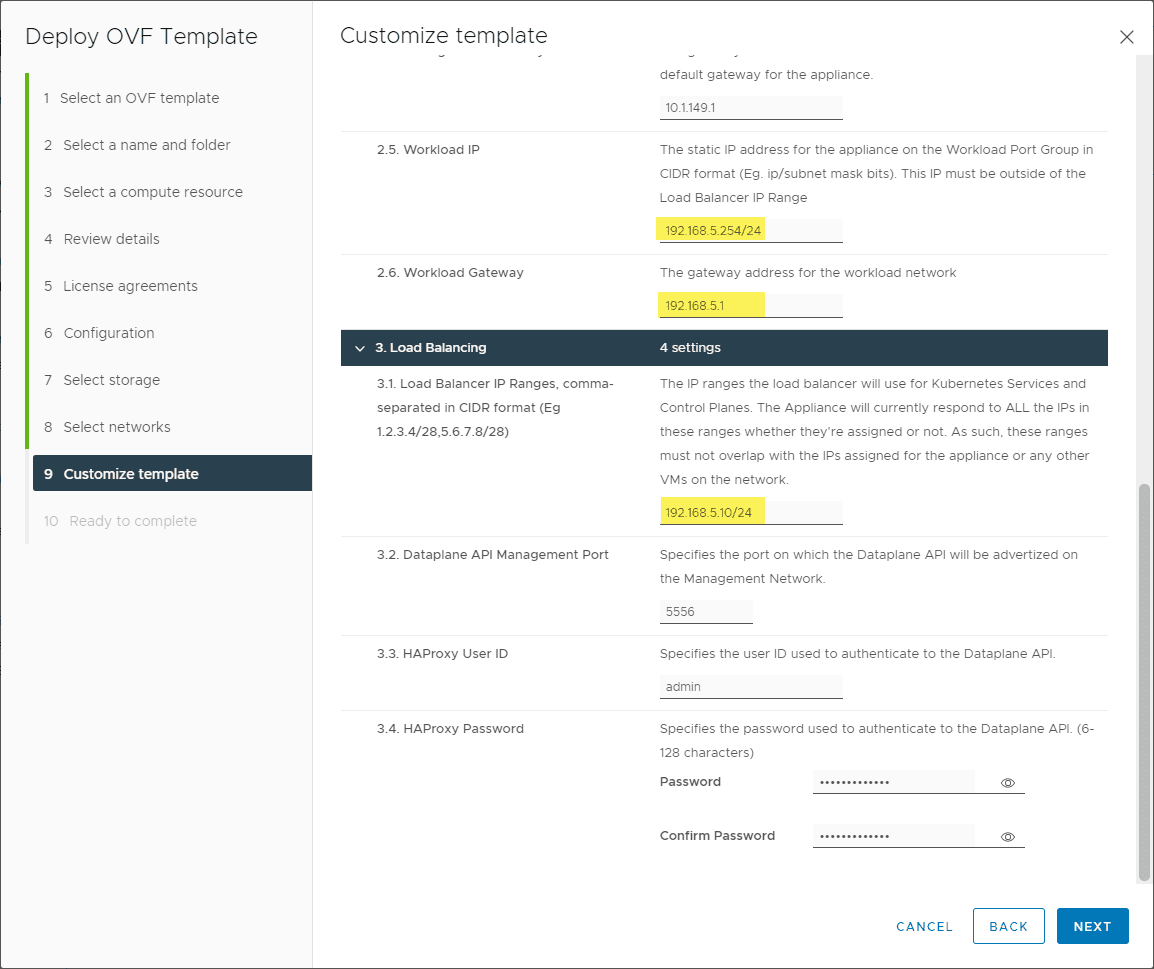 Step 9 has several settings here that you want to pay attention to. There are many network settings and IP address configurations that you want to make sure you have mapped out before you get to the point of deploying your HAProxy. These include your management IP and workload IP.