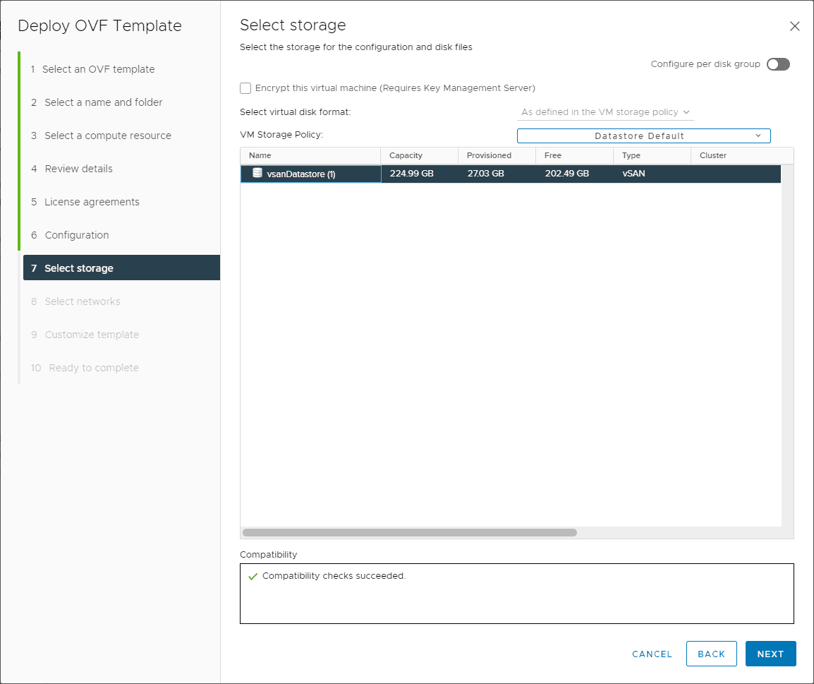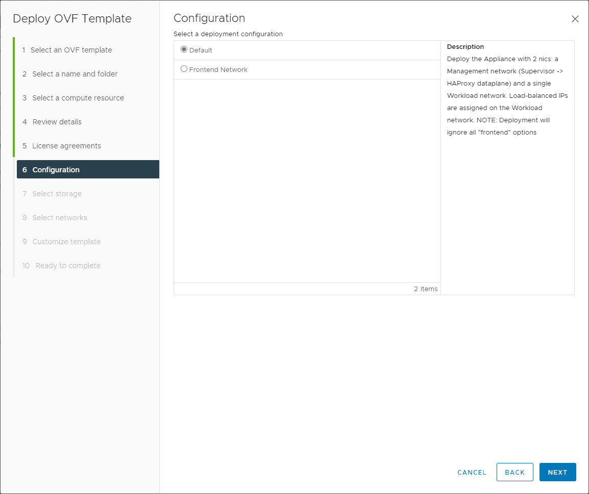 Here, I am choosing the Default configuration. This is the configuration that deploys the appliance with 2 nics: a management network (Supervisor – > HAProxy dataplane) and a single Workload network. Load-balanced IPs are assigned on the Workload network. NOTE: Deployment will ignore all “frontend” options.