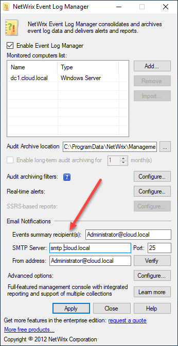 Now, just make sure your SMTP properties are configured as you want them with the correct SMTP server and email address configured for both the from and the Events summary recipients configured.