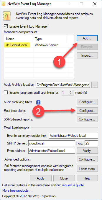 After installing the utility, which is just a “next, next, finish” process, you will see a simple GUI to configure. Basically you will add the machines (domain controllers) you want to monitor, as well as add the EventID filters you want to alert on. After you add your DC name, 2) click the Configure button to add the real-time alerts to Monitor for ZeroLogon vulnerability events in Active Directory.