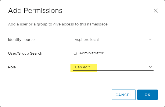With the namespace created, you now need to setup permissions and a storage policy for the namespace.