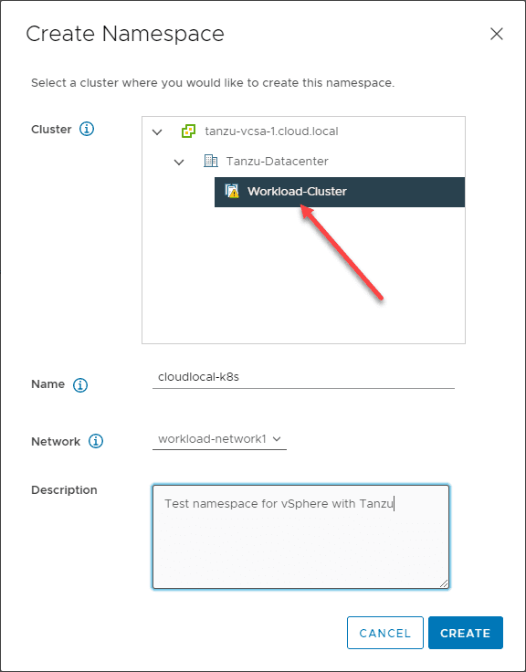 Choose your Workload Cluster, network, choose a name, and enter a description if you would like.