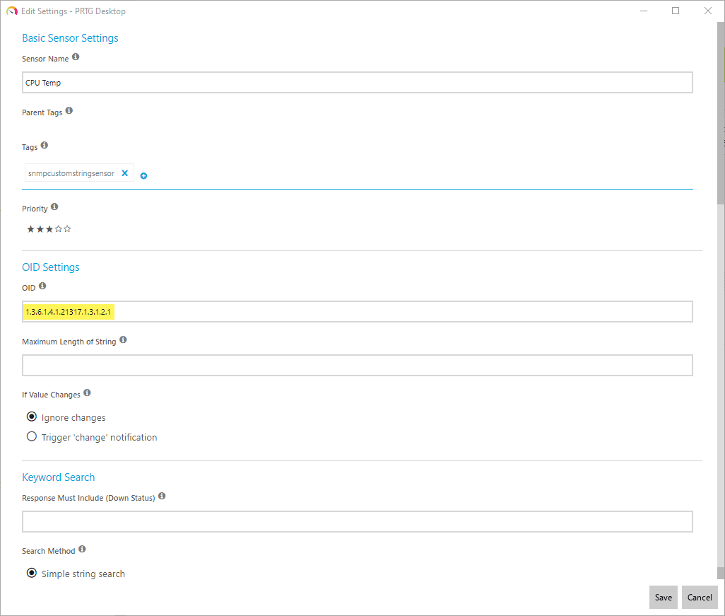 In PRTG I was able to get the SNMP status sensors to display correctly by using the Custom SNMP String sensor. Note below, I have plugged in the OID for the CPU Temp.