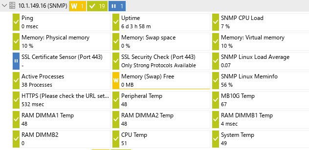If you have server hardware that allows monitoring via IPMI or some other out-of-band interface via SNMP, you can easily query the state of your hardware sensors. As an example, if you are running Supermicro servers in your lab, you can easily monitor the hardware status of your Supermicro servers with the SNMP sensor in PRTG.