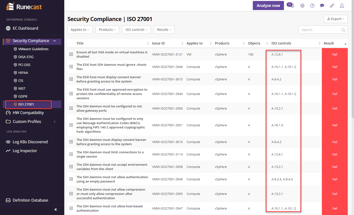 After enabling the new ISO 27001 knowledge profile, analyze your environment and the new ISO 27001 finding will be noted. One of the powerful features of the Runecast ISO 27001 security compliance scan is it notes the specific ISO control for which the finding applies. This takes any guesswork out of matching up findings with the specific ISO controls. Brilliant!