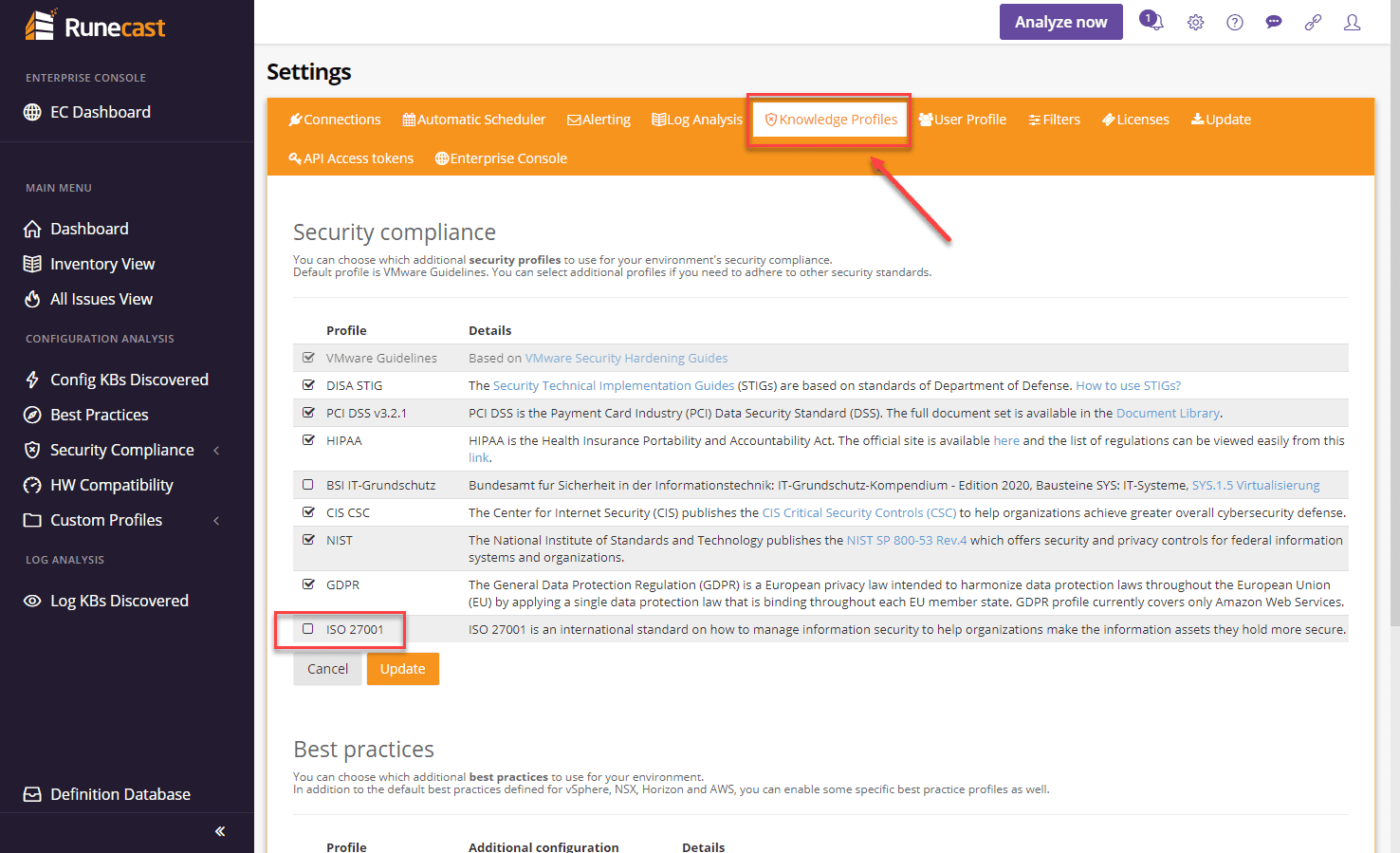 Runecast implements the new compliance checks in what it calls Knowledge Profiles. The knowledge profiles can easily be checked and unchecked under the Settings in the WebUI. After the appliance has been upgraded to the 4.6 release, you simply go in and select the new ISO 27001 knowledge profile.
