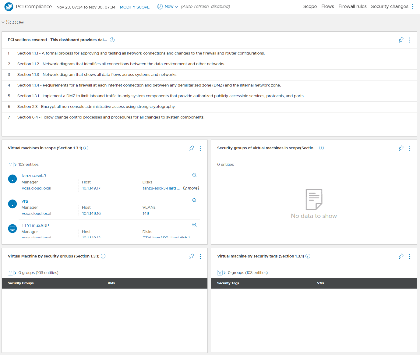 Below, I have simply copied and pasted the PCI sections displayed in vRNI 6 under the PCI compliance assessment.