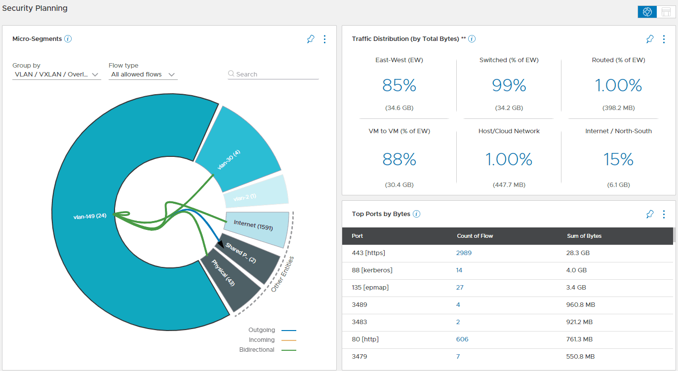 Using the security planning assessment, you get a powerful view of overall network traffic flows in your vSphere environment. This is especially useful for planning your micro-segmentation initiative. It includes: