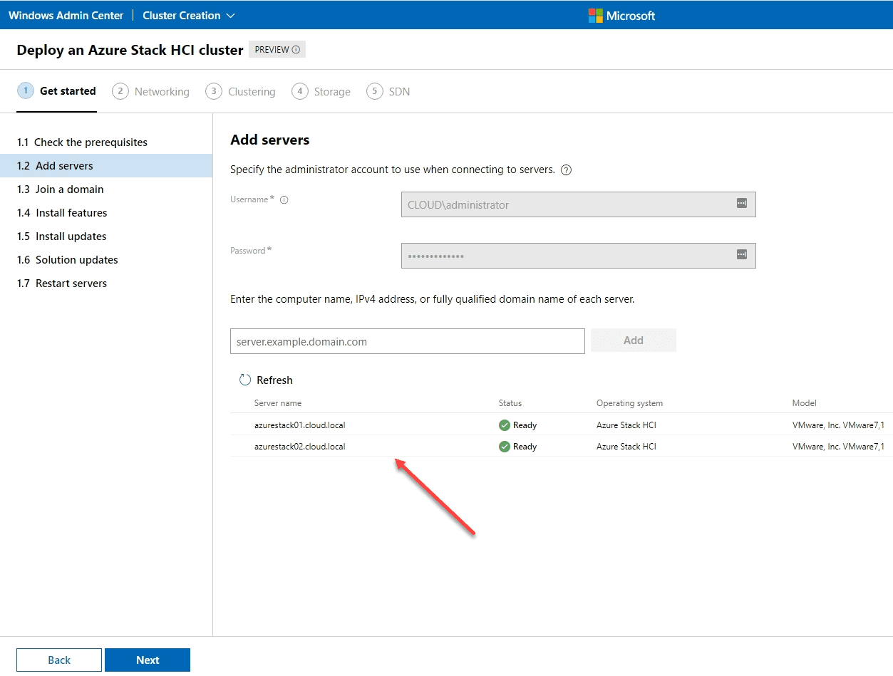Next, you will need to add the servers you want to be a part of the server cluster. There is a two-node minimum for creating the Azure Stack HCI cluster. I am adding two nodes to create the cluster.