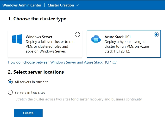 You will see the choice to create an Azure Stack HCI cluster. You will need to choose between the cluster location being in one site or two sites.