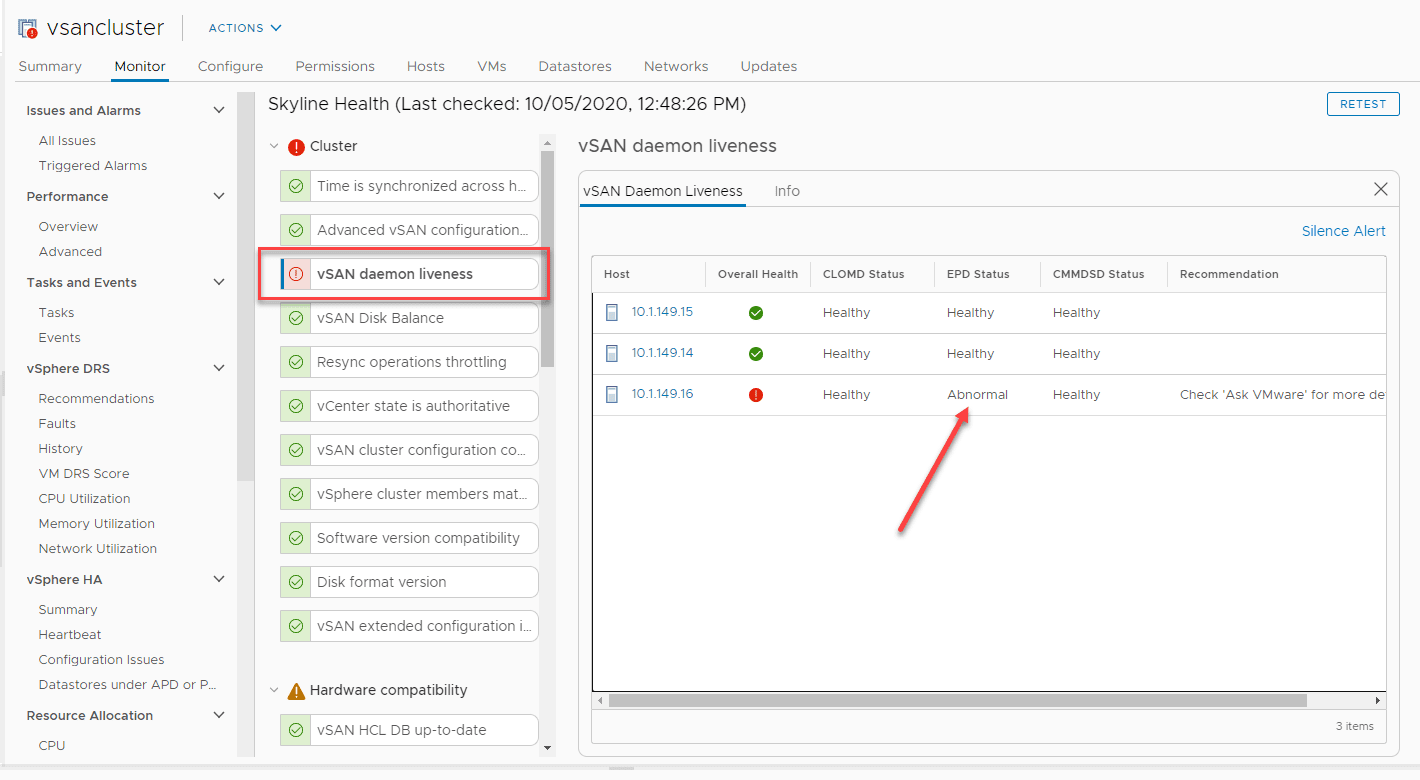 In the vSAN heath status check, I would see the EPD status as abnormal. As it turns out VMware recently released a KB article covering this issue here: