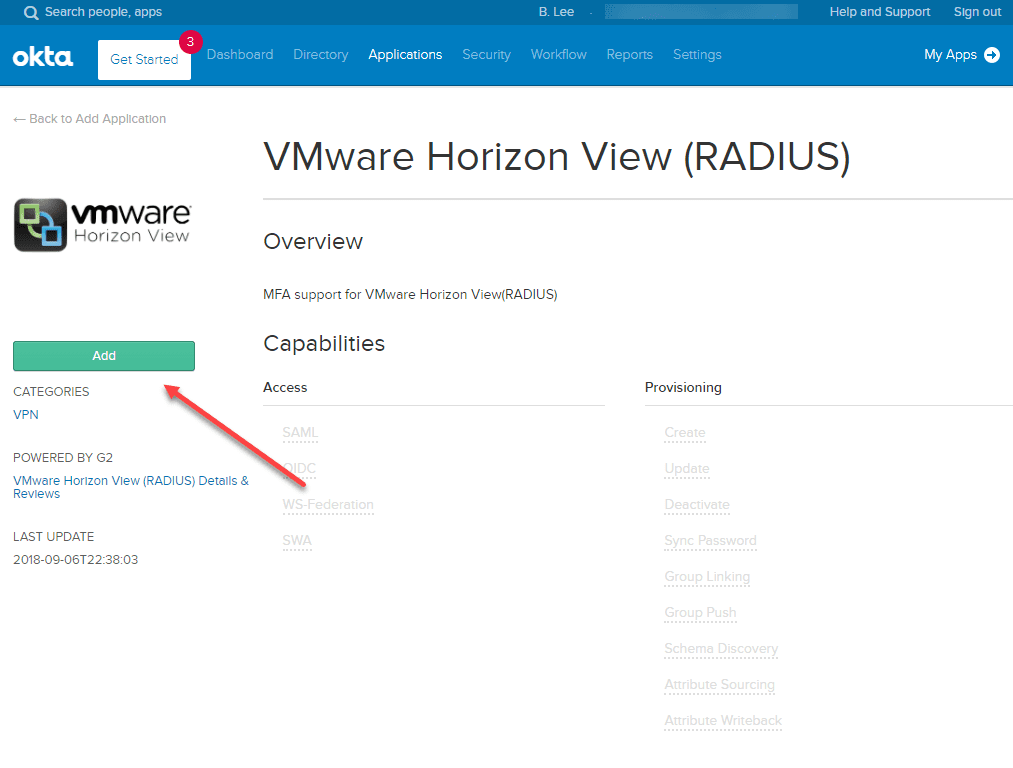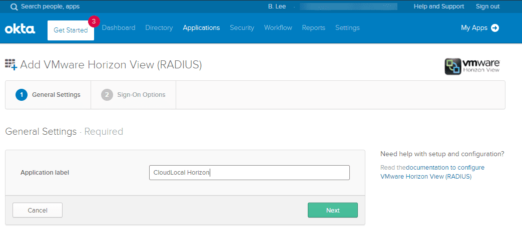 Next, we need to add the OKTA VMware Horizon RADIUS application to the OKTA account. The OKTA RADIUS application for VMware Horizon provides the target for the RADIUS Agent that exists on-premises and it is the means by which you can assign users to your VMware Horizon environment. Let’s walkthrough adding the application. Navigate to Applications > Add Application.