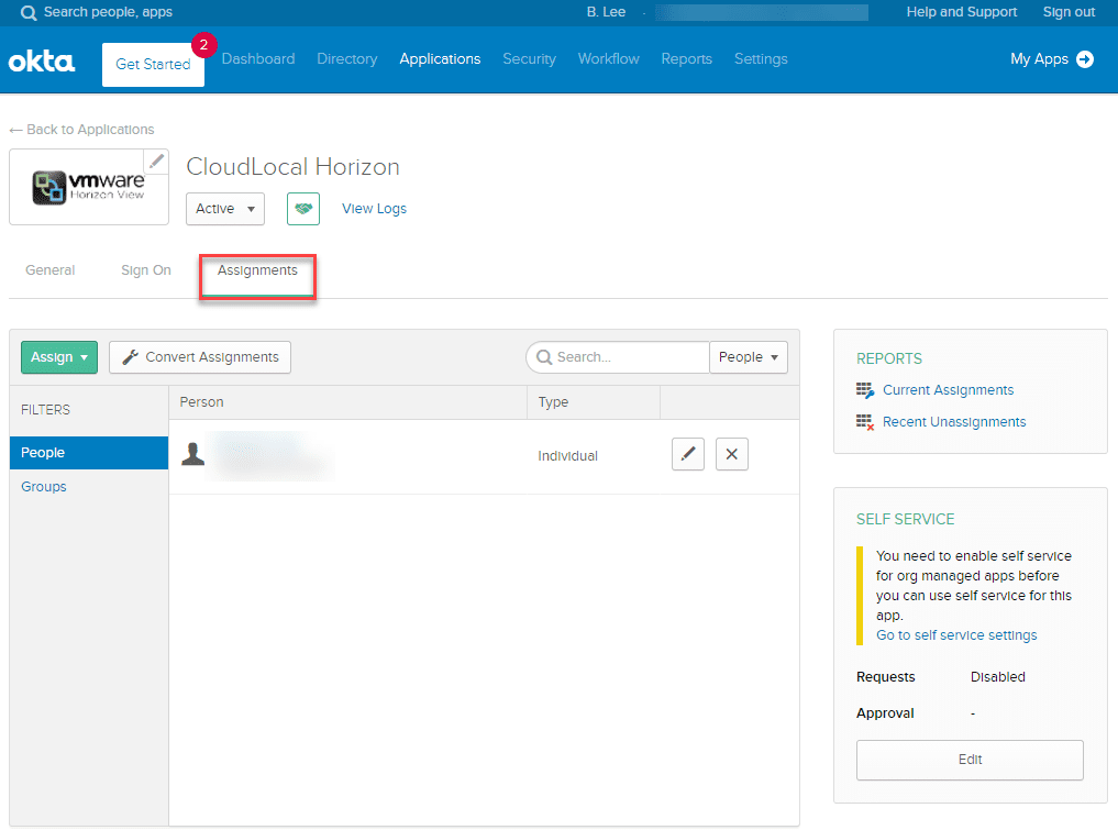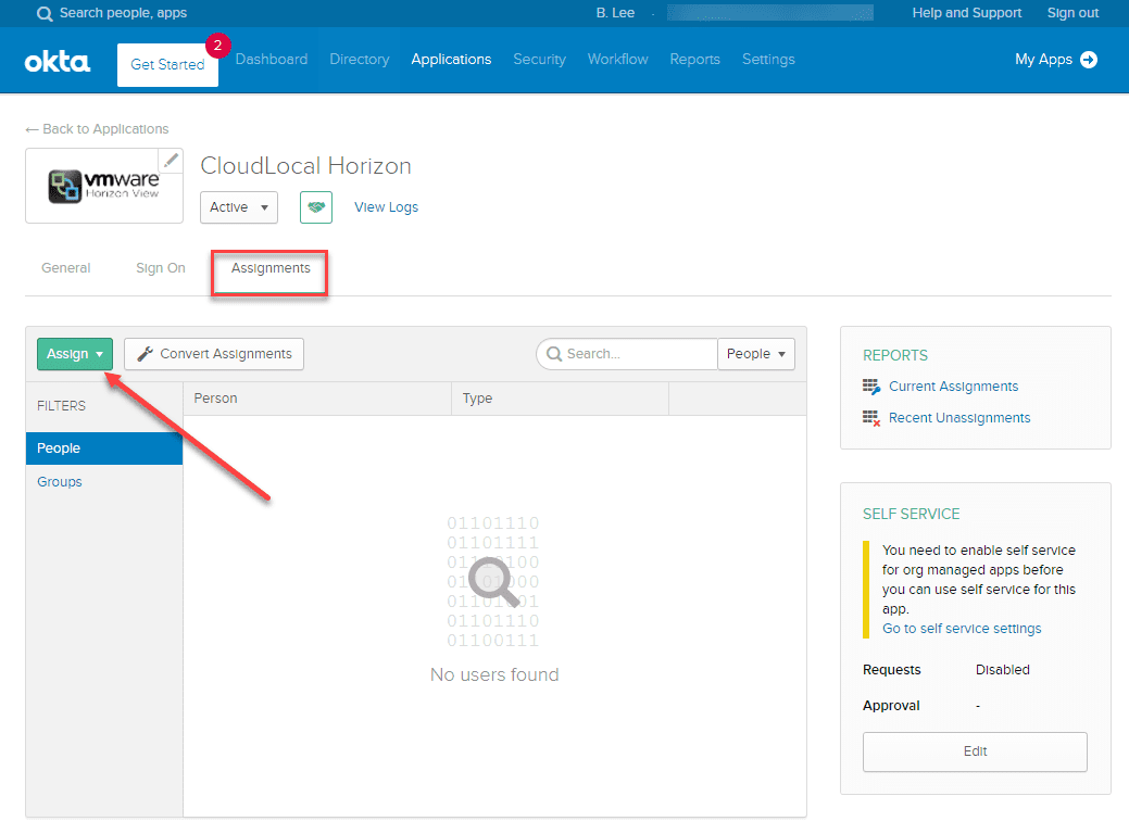 Now, you just need to assign users to your VMware Horizon RADIUS application. Click the Assign button. You will select to assign People or Groups.
