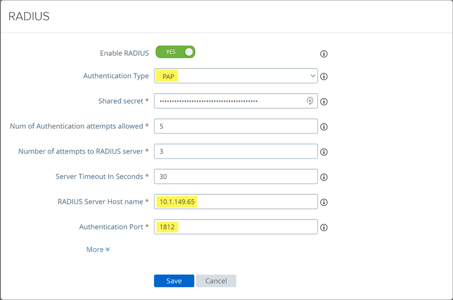 Under the RADIUS settings, choose PAP, set the shared secret, RADIUS Server Host name, and port.